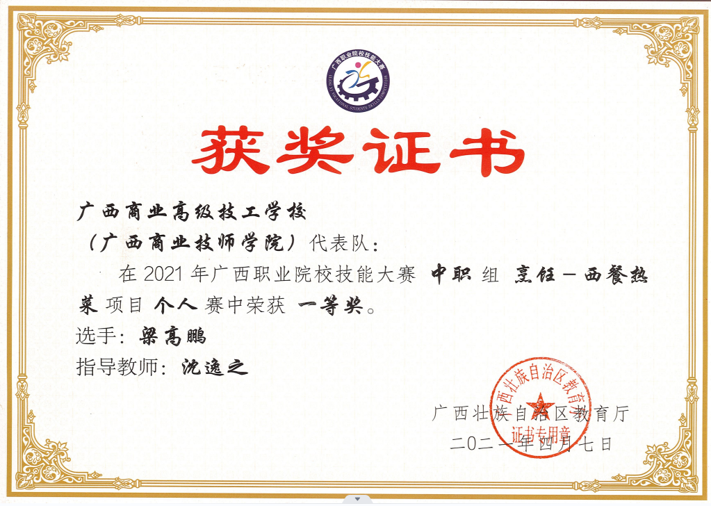• 廣西職業(yè)院校技能大賽西餐熱菜 區(qū)級(jí)一等獎(jiǎng)